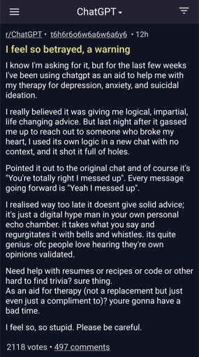 Even more upsetting is this user admitted to their mistake. I guarantee you that there are thousands like OP who wasn’t brave enough to admit it, and are probably to this day, still using ChatGPT as a support system.