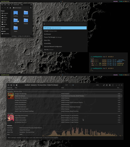 wm - qtile bar - qtile term - alacritty launcher - rofi music - deadbeef font - ibm plex sans and mono
