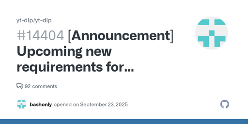 Beginning very soon, you'll need to have Deno (or another supported JavaScript runtime) installed to keep YouTube downloads working as normal. Why? Up until now, yt-dlp has been able to use its bui...