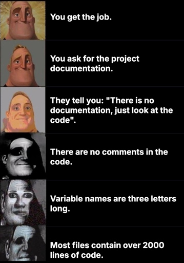Recently I moved to a different team and I’m not kidding 1single file has 1600+ lines of code and not a single comment. And docs for entire code base is less than 100 lines. Help me…