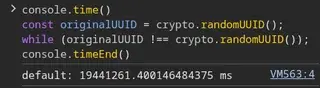 console.time()jots down the current time, if you do that twice and put stuff in the middle you get two times and the difference between them is how long that stuff took to doconsole.timeEnd()uses the last execution ofconsole.time()as the starting point to work out how long the stuff took to doconst originalUUID = crypto.randomUUID()generates a Universally Unique IDentifier, which can be thought of as a very large very random number, by use of a pseudorandom number generatorwhile(stuff)evaluates the stuff for truthiness (1 + 2 = 5 would be false, 50 < 200 would be true, ‘my username starts with the letter k’ would be true) it’s typically followed by a ‘block’ of code, that is lines beginning with{and ending with}, but we don’t see that here, which means we can readwhile(stuff)as “keep checking ifstuffis true in an endless loop, and only continue to the next line if one of the checks ends up beingfalse”the