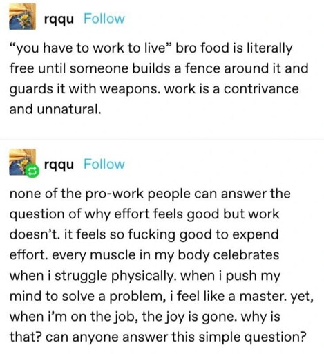 Edit: Could you please chill it with the taking everything so bloody seriously? It’s low-hanging fruit leftist agitprop from c/196. It doesn’t aim to be coherent with the very letter of Marx or whatever leftist group/cult-leader you prefer.