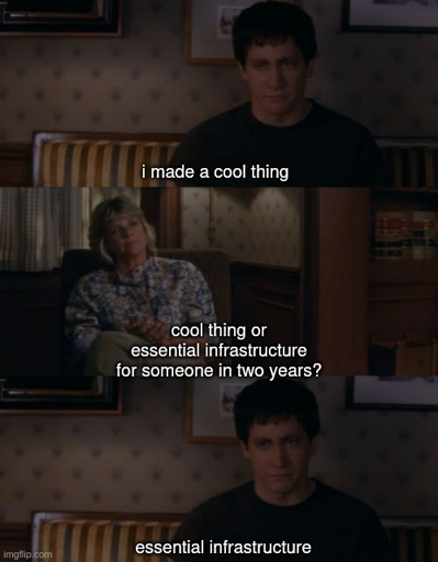 Lmao and I can tell you who gets to support that weird hacked together kinda janky piece of infrastructure!