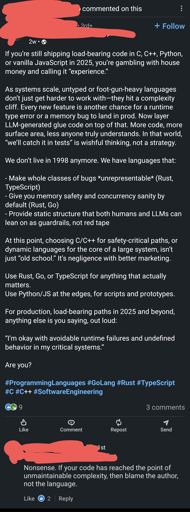 I’m not even going to bother commenting on that train wreck of a post, but I just wanted to mention that I hate the writing style of programming-related LinkedIn posts. They’re just chock-full of sweeping generalizations presented as absolute truth in an extremely patronizing tone.