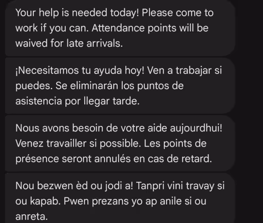 This is just funny at this point. Yes they send every text in multiple languages which gets annoying when my phone goes off 8 times cause they want to tell people when someone is here to discuss benefits.